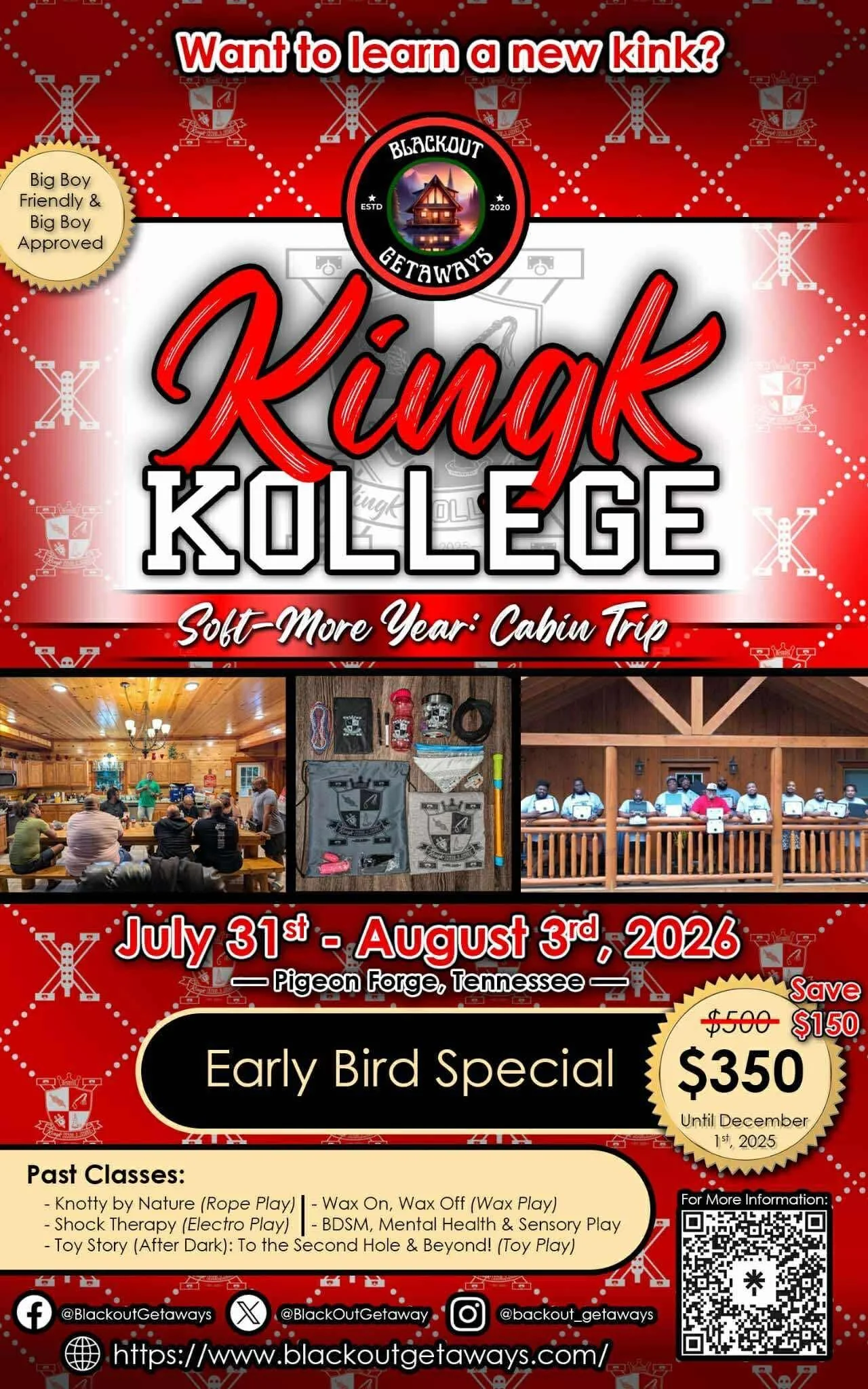 Join us for Kingk Kollege, as our expert facilitators, experienced in various aspects of kink and dynamics, will lead interactive workshops and engaging discussions tailored to both beginners and those with more experience. You'll learn about the foundations of consensual kink play, including safe practices, essential tools and techniques, and the psychological aspects that enhance the experience. Dive deep into power dynamics, communication skills, negotiation, and aftercare to build solid knowledge and confidence in your exploration.